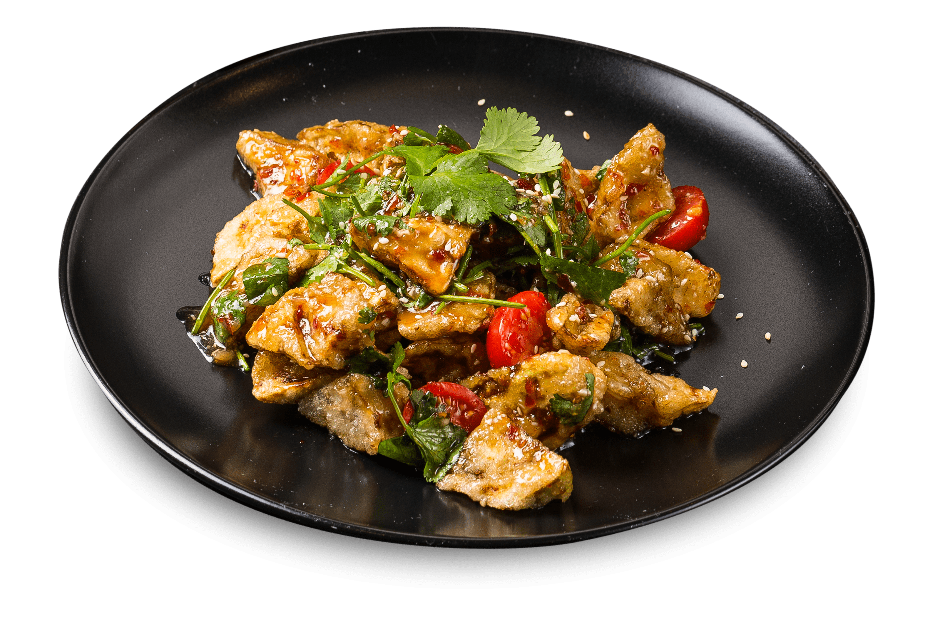 250 g баклажаны, помидоры, зелень, фирменый соус чили-сладкий, семена кунжута