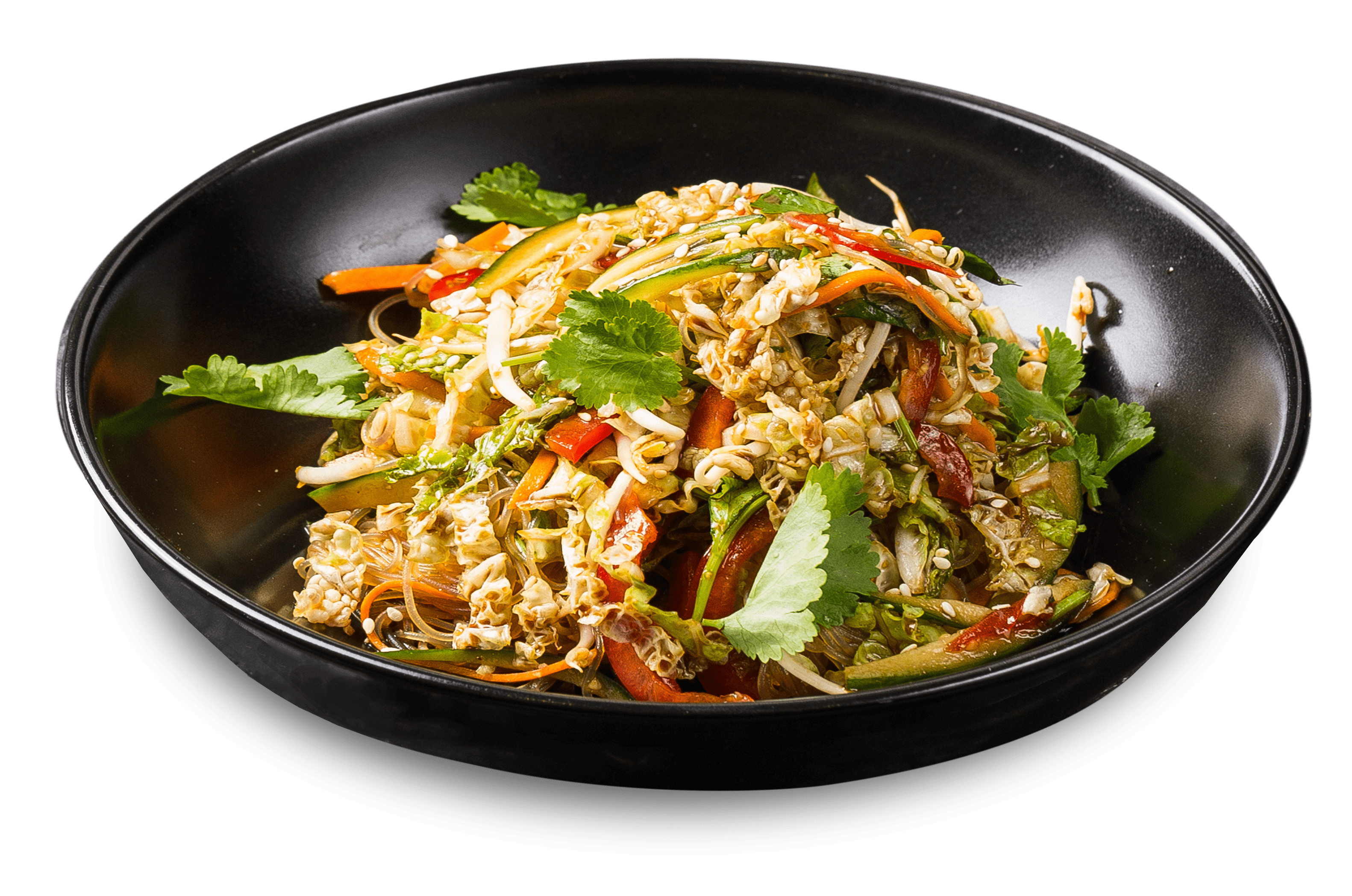 пекинская капуста, морковь, перец болгарский, ростки сои, смесь тайских специй, лапша фунчоза, семена кунжута