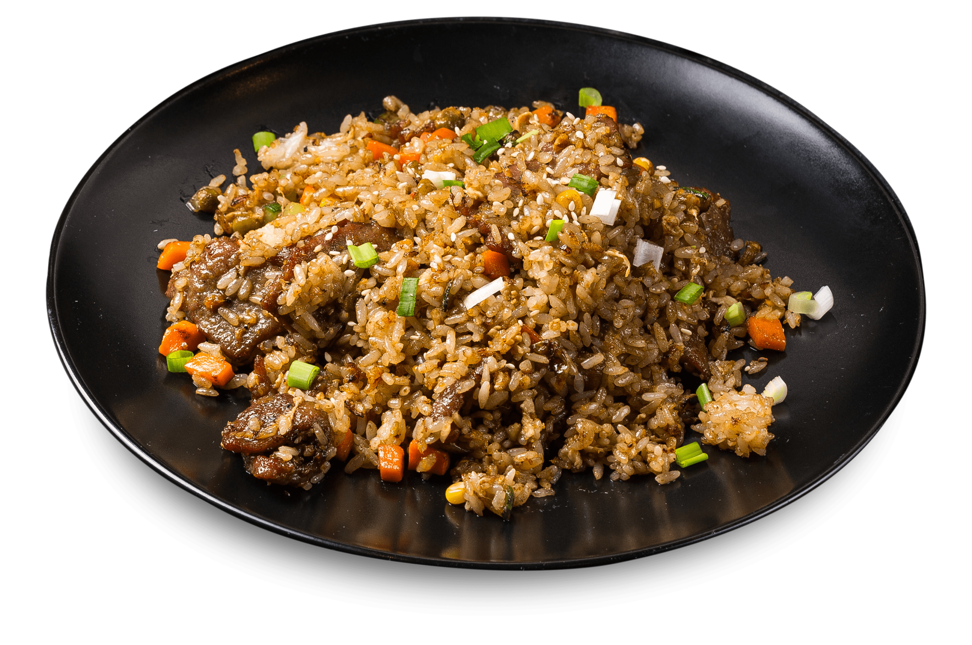 перец болгарский, лук репчатый, грибы муэр, говядина, фирменный тайский соус черный перец, зелень, семена кунжута, гарнир - паровой рис