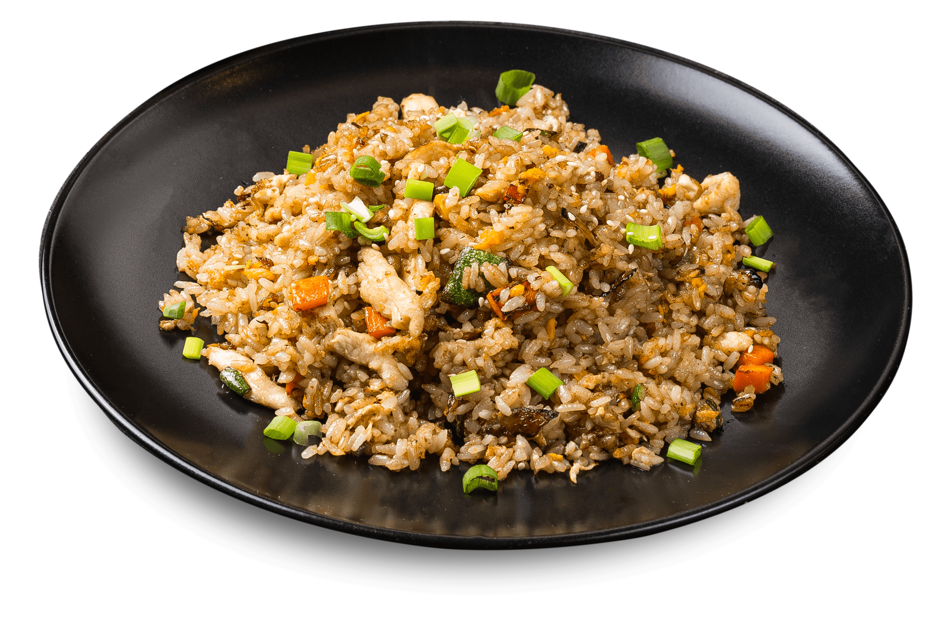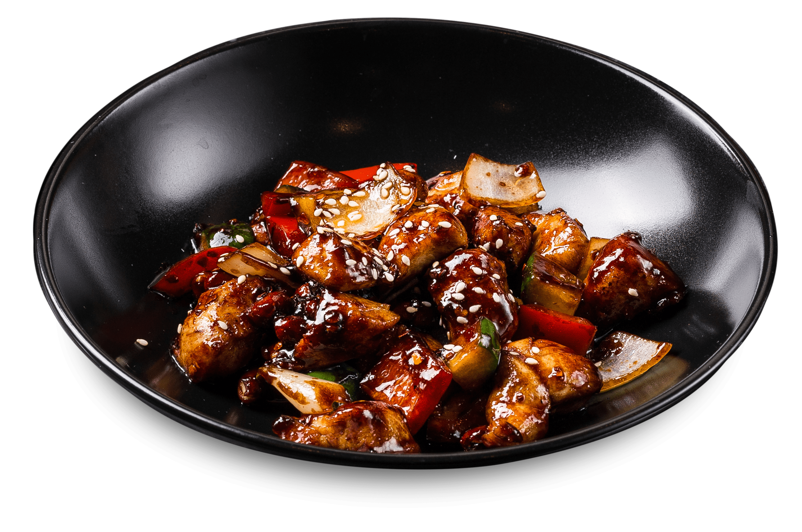 300 g куриное филе, огурец, перец болгарский, лук репчатый, грибы муэр, перец чили, фирменный соус, зелень, семена кунжута, гарнир - рис на пару