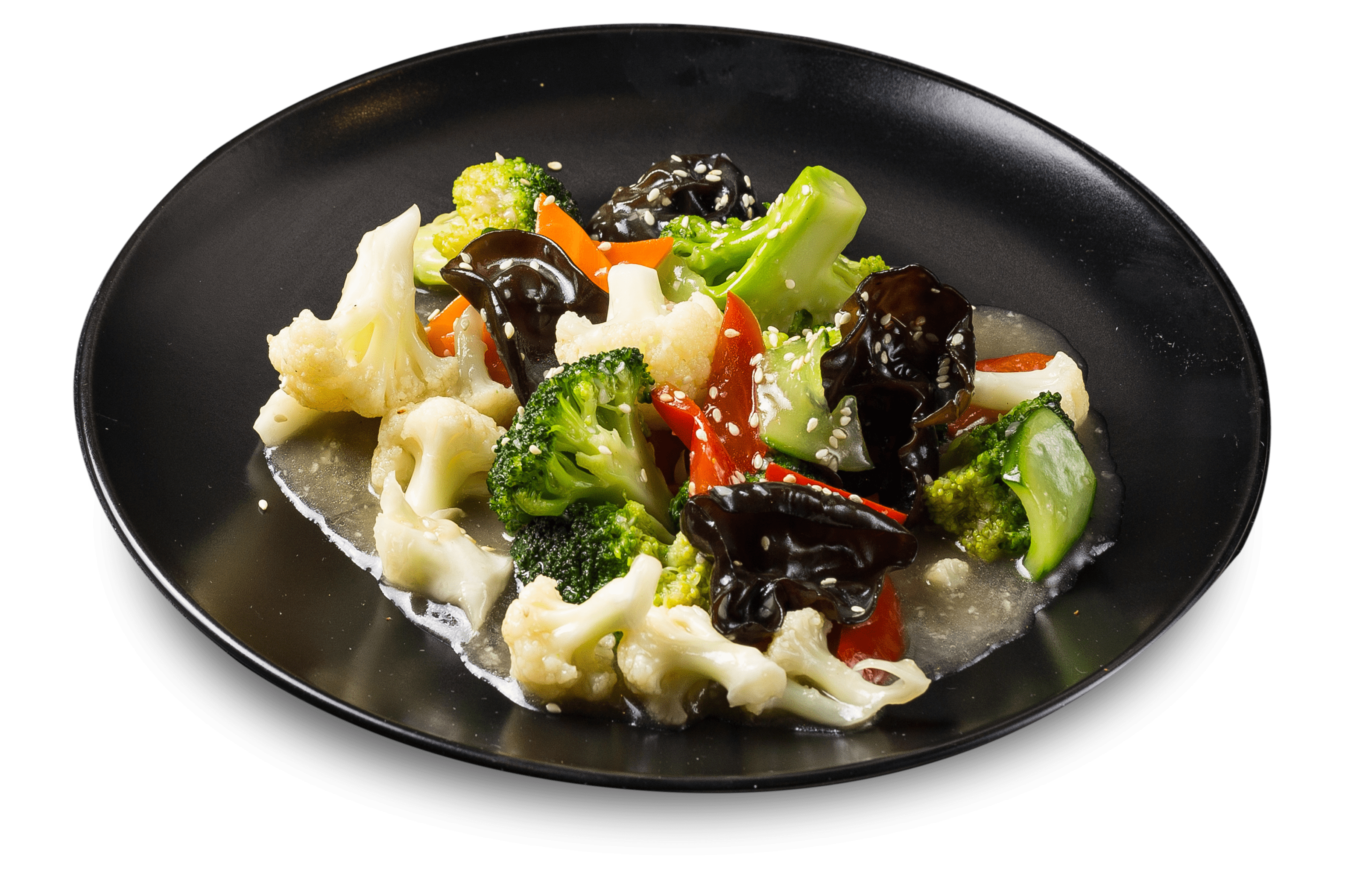 брокколи, перец болгарский, грибы муэр, цветная капуста, чесночный соус