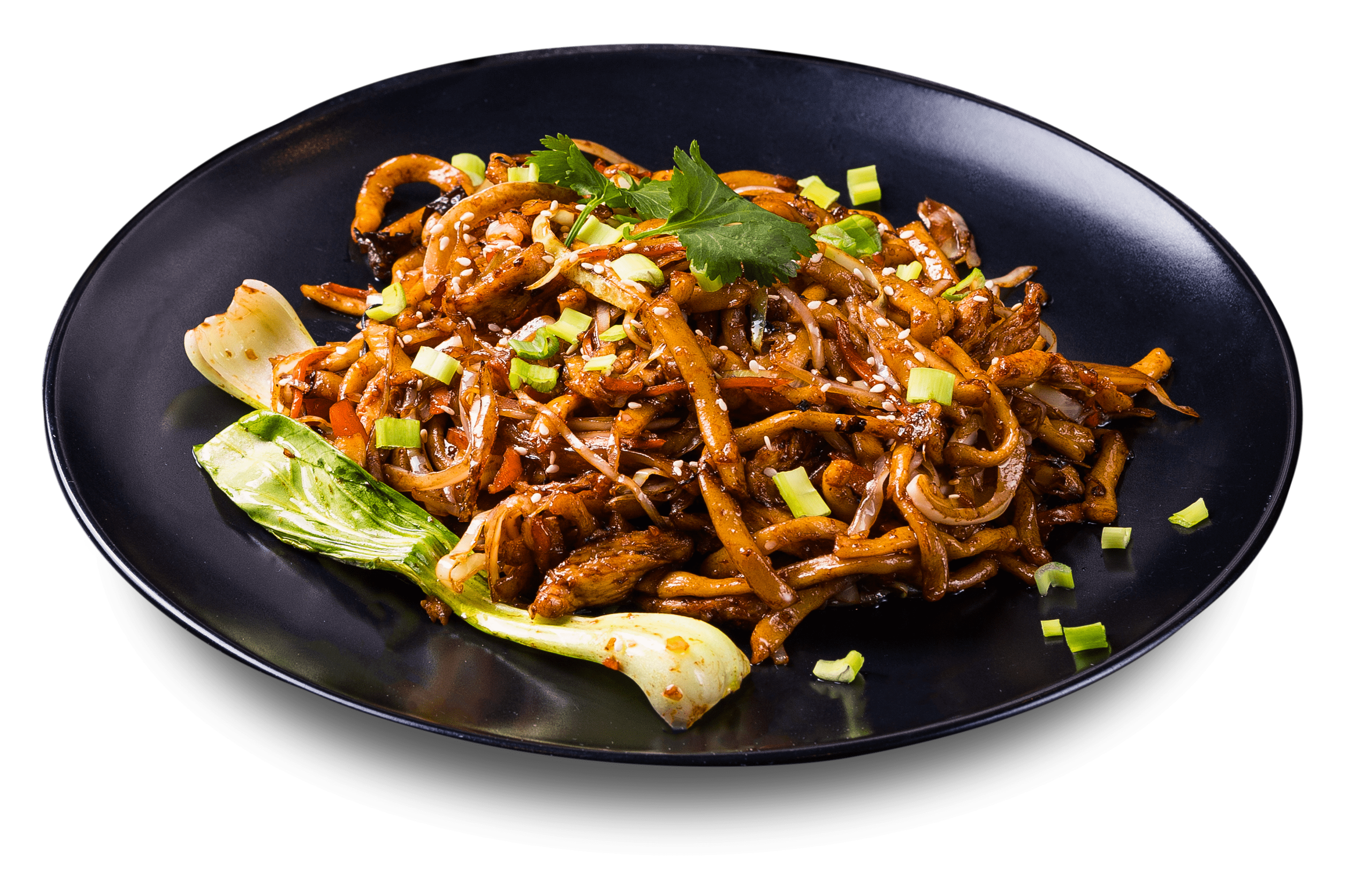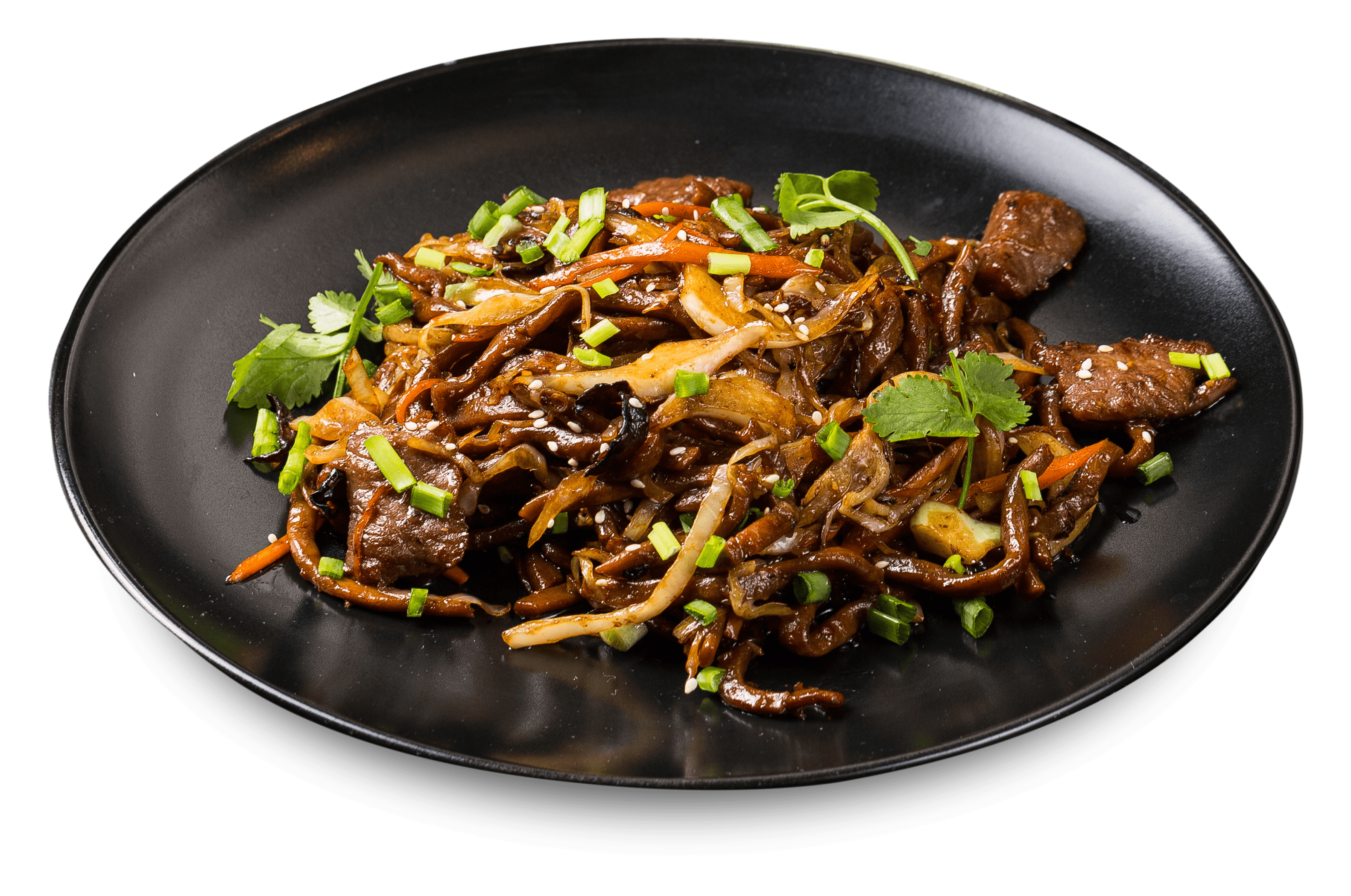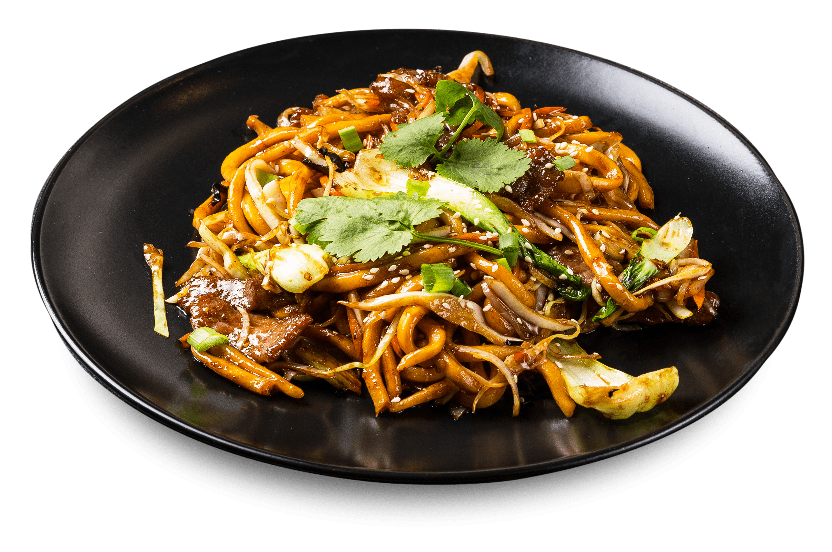 400 g Домашняя лапша, телятина, перец болгарский, капуста, морковка, древесные грибы, зеленый лук, репчатый лук, чеснок, сельдерей, фирменный тайский соус