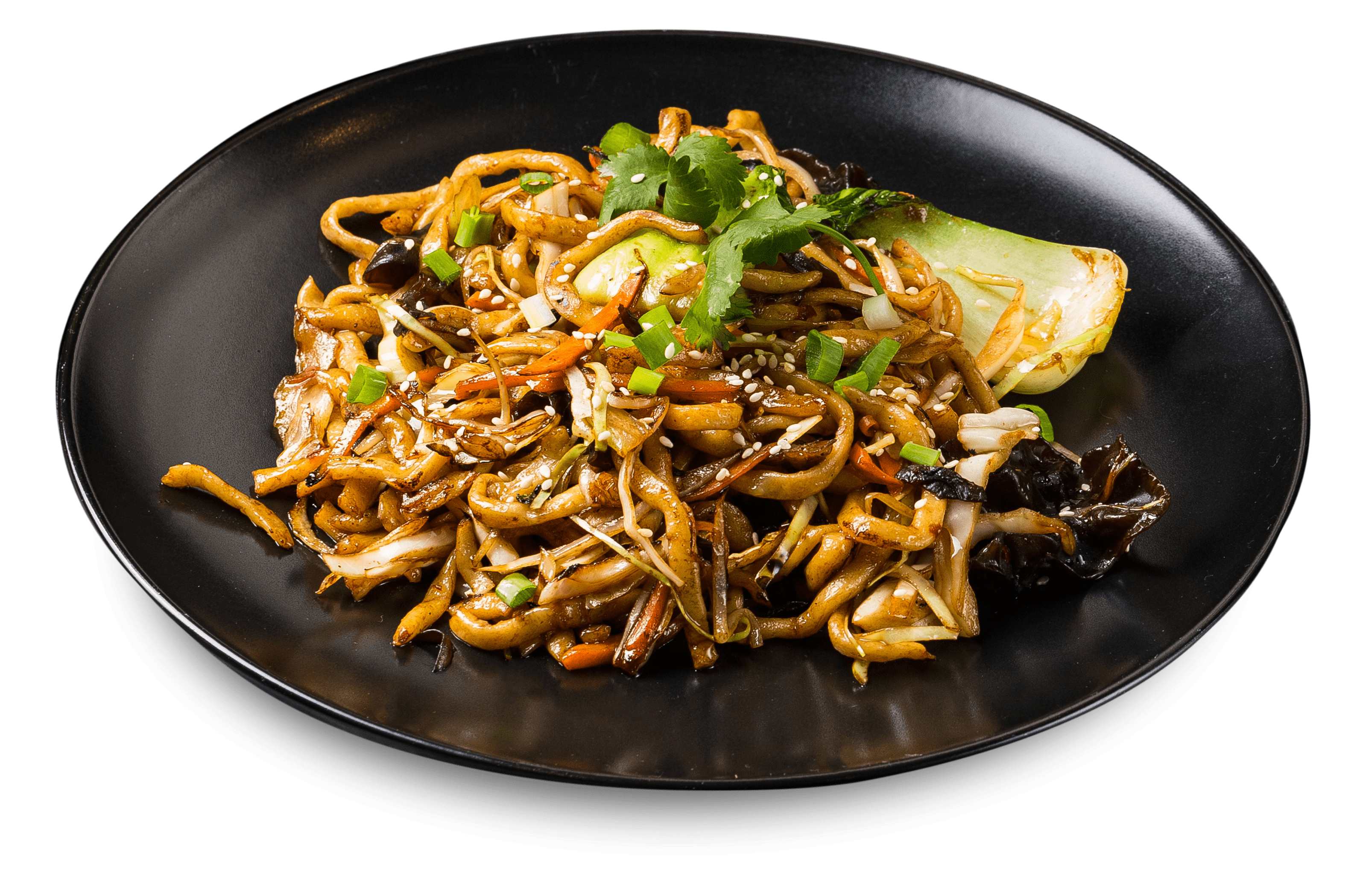 400 g Домашняя лапша, перец болгарский, капуста, морковка, древесные грибы, зеленый лук, чеснок, сельдерей, фирменный соус