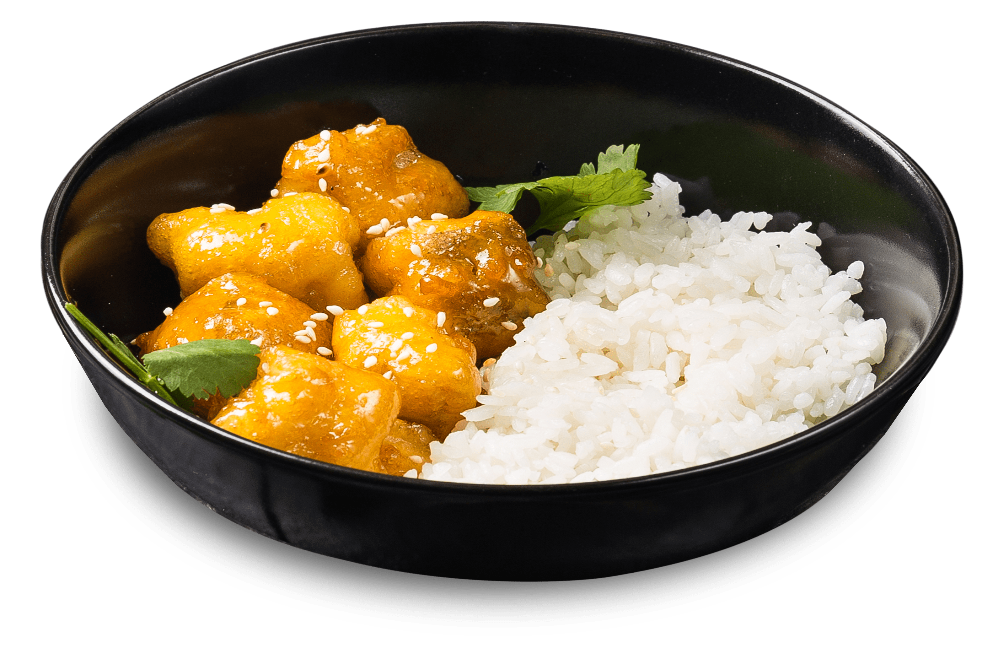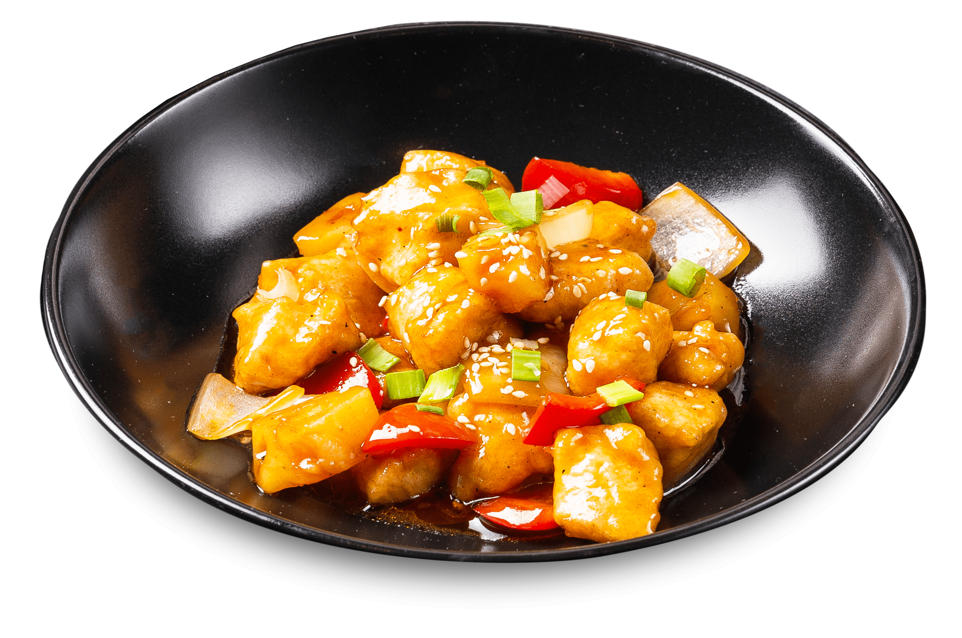 куриное филе, ананас, перец болгарский, лук репчатый, фирменный тайский кисло-сладкий соус, семена кунжута, гарнир - паровой рис