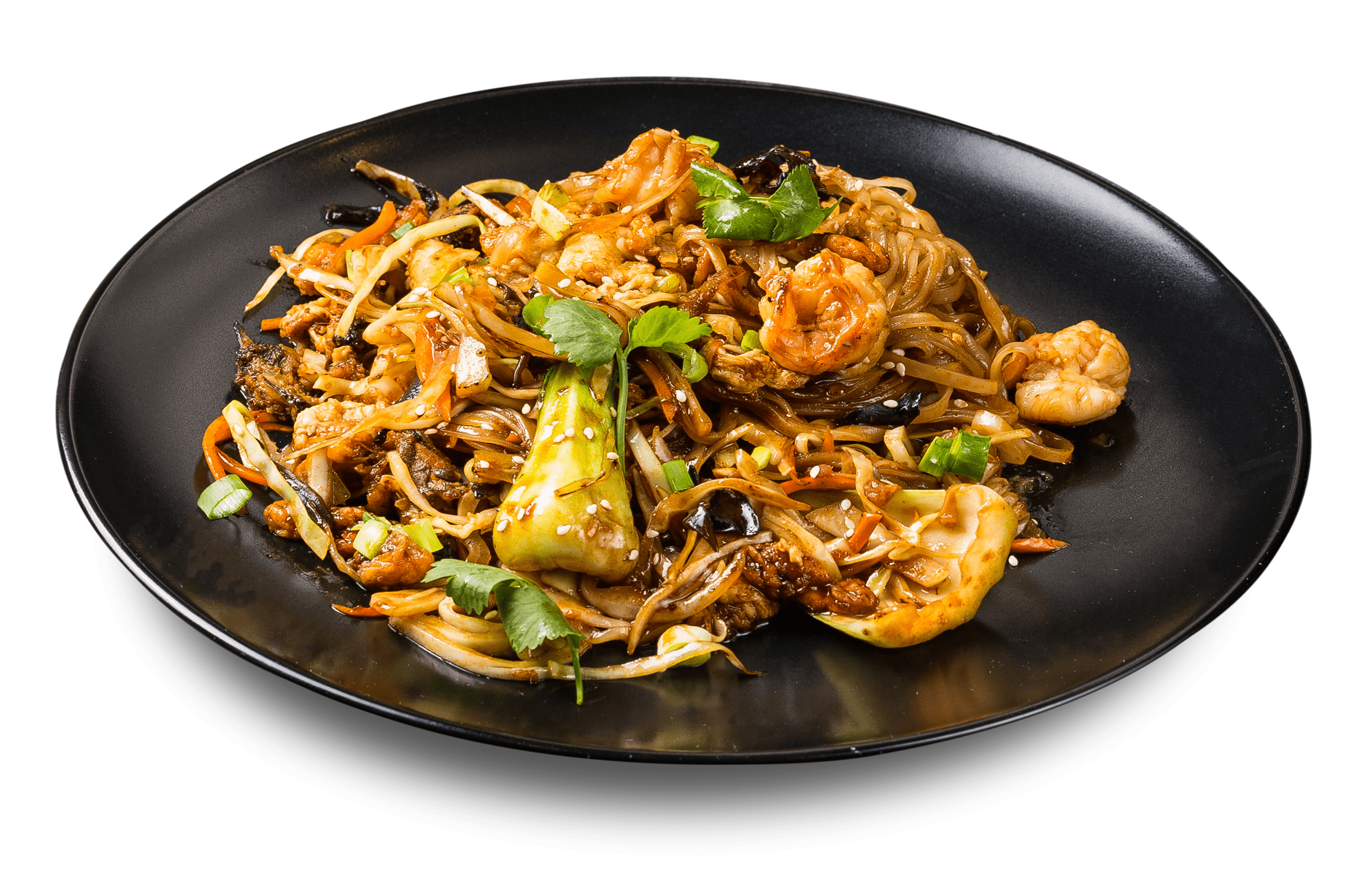 400 g Домашняя лапша, креветки, перец болгарский, капуста, морковка, древесные грибы, зеленый лук, чеснок, сельдерей, фирменный соус