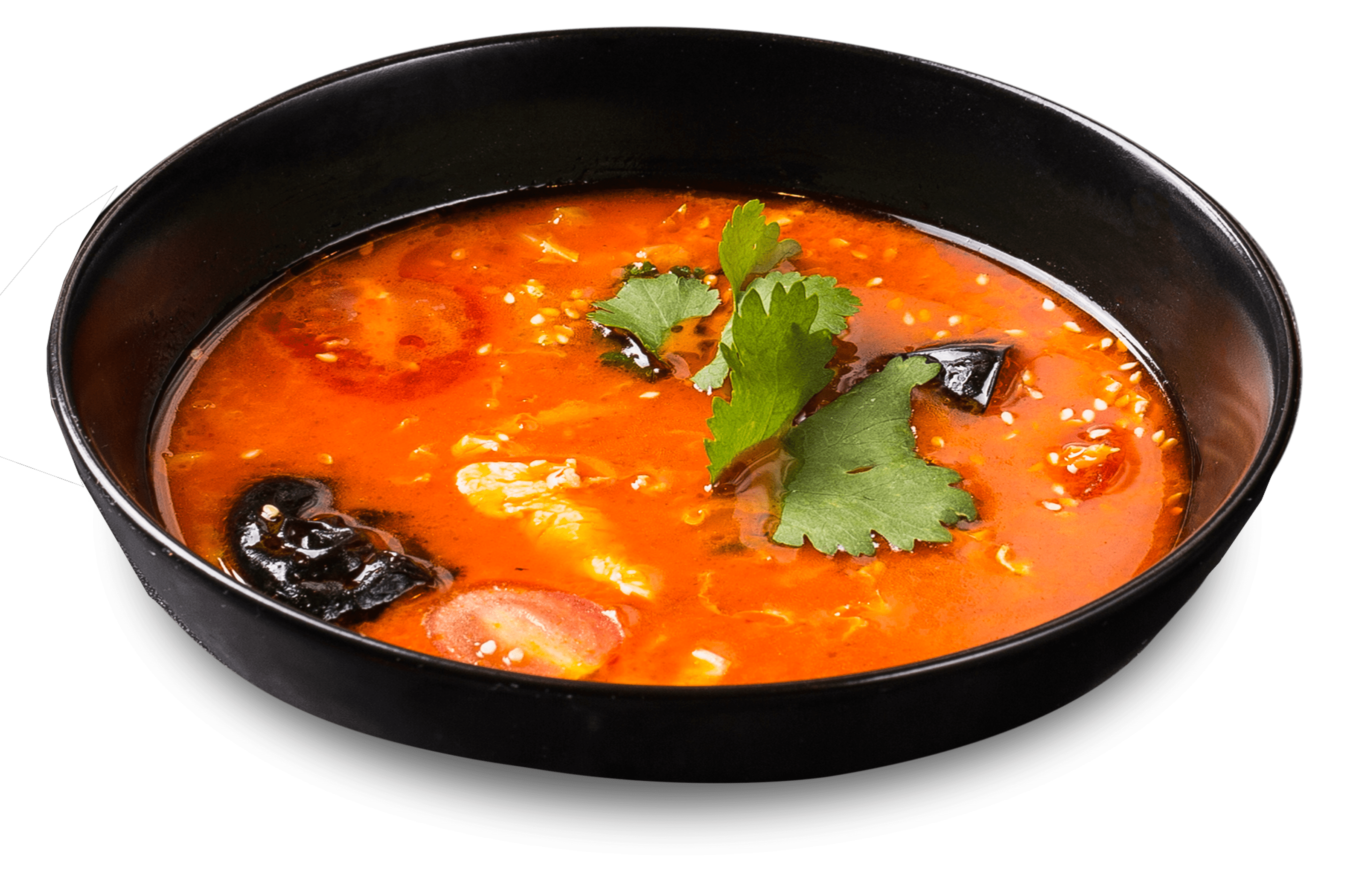 креветки, древесные грибы, помидоры черри, галангал, имбирь, лемонграсс, листья кафир-лайма, кокосовое молоко, кинза, семена кунжута