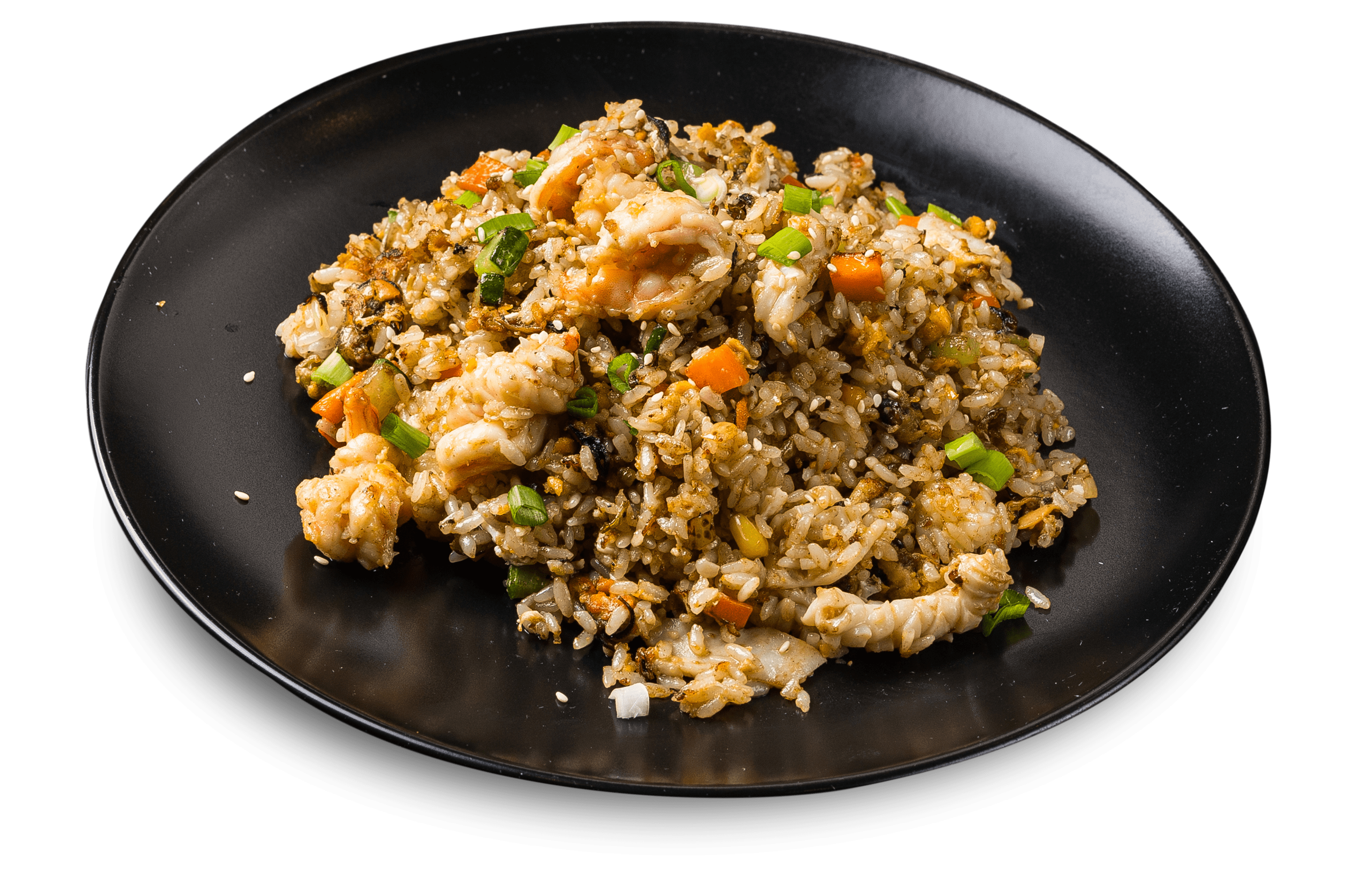Тайский рис, креветки, кальмар, осьминог, мидии, перец болгарский, морковь, зеленый лук, зелень, кукуруза, горошек, огурцы, фирменный соус