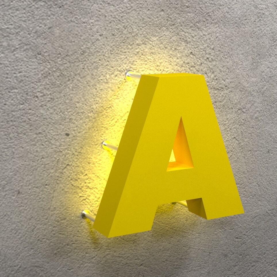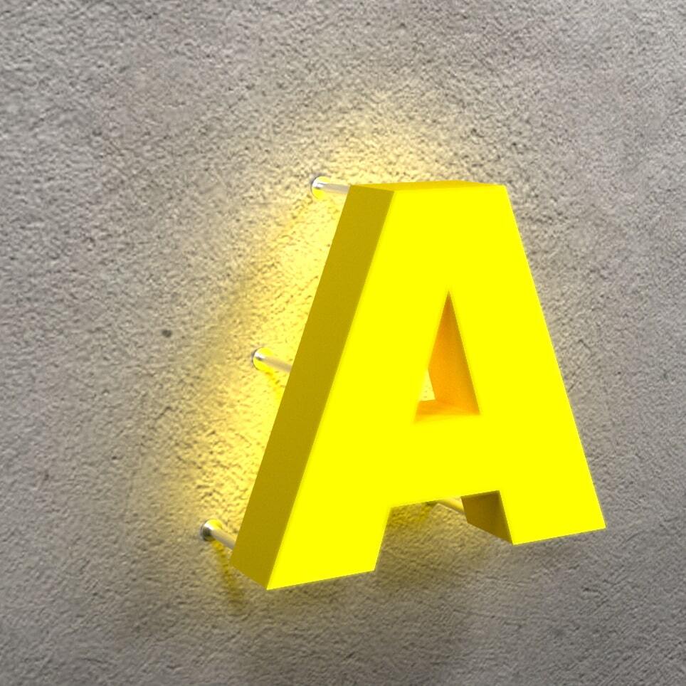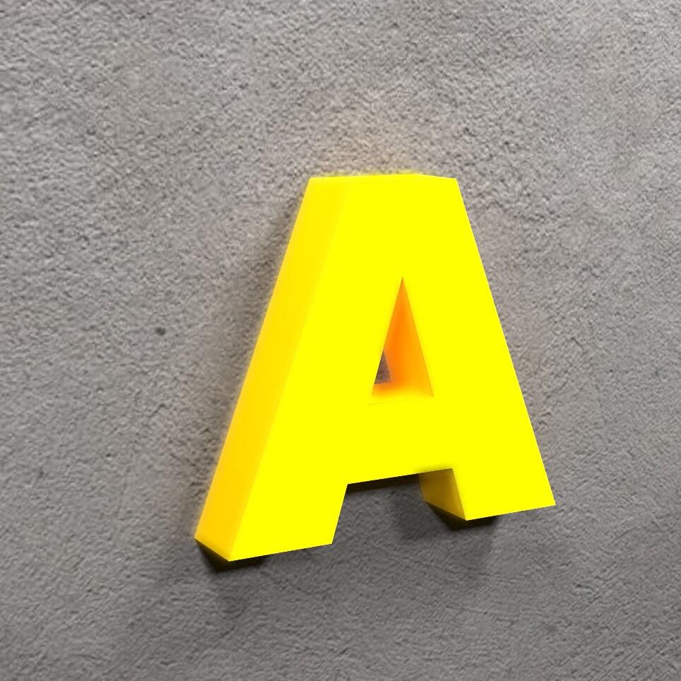 Подсветка с задней стороны буквы создает эффект ареола вокруг нее. Буква выполнена из ПВХ, задник из акрила и закатана пленкой на вкус клиента.